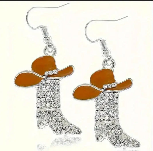 “Texas” Western Boot & Hat Earrings - Hypoallergenic Alloy, Plated White Gold, Synthetic Cubic Zirconia Accents, 1 pair