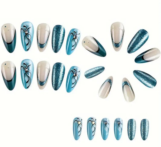 “Blue Flower” Stiletto Shaped Nail Decals with Mixed Color Scheme, Almond Shape, Medium Length