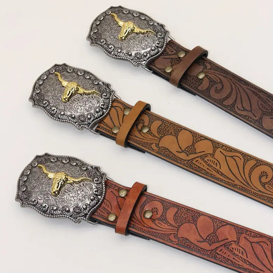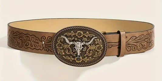 Embossed Bull Head Buckle, - Versatile Casual Wear for Jeans & Dresses, Premium Faux Leather Western Belt