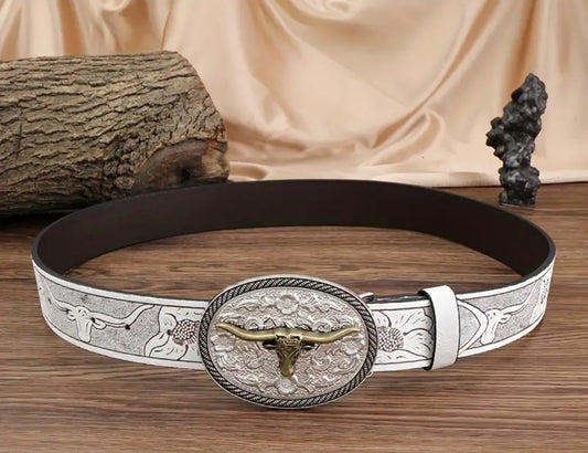 1pc White Vintage Western Bull Head Buckle Pu Leather Belt Embossed