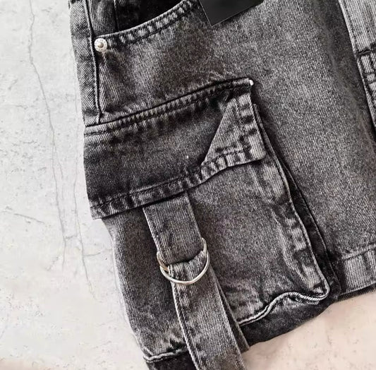 “Goth Black” Vintage Denim Streetwear Skirt, Multi Pockets