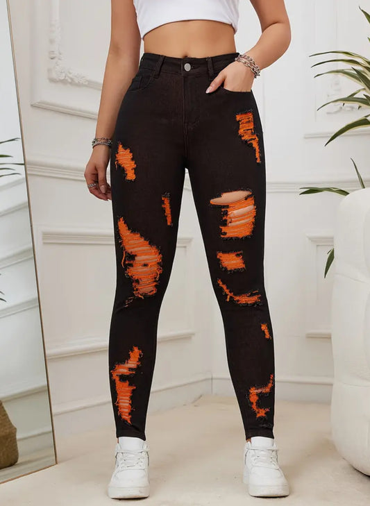 Women’s Neon Orange Streetwear Distressed Skinny Jeans