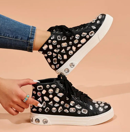 Women’s Rhinestone Decor Preppy Skate ShoesLace Up High Top Flat Sneakers
