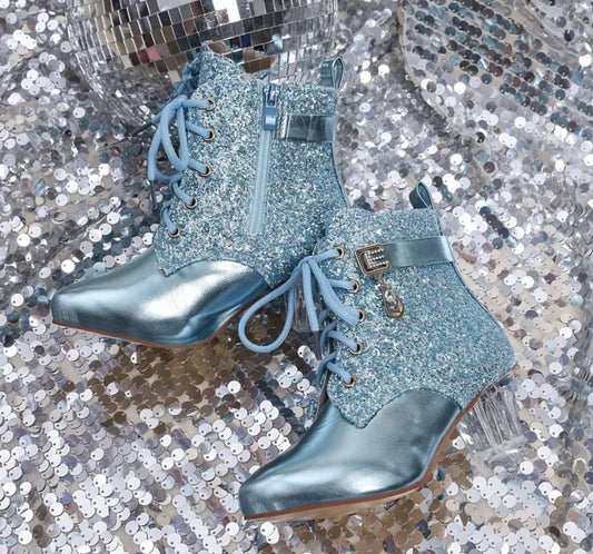 Sparkling Lace-Up Ankle Boots Crystal Chunky Heel - Pointed Toe, Side Zipper, Posh 💋 Women’s & Teens