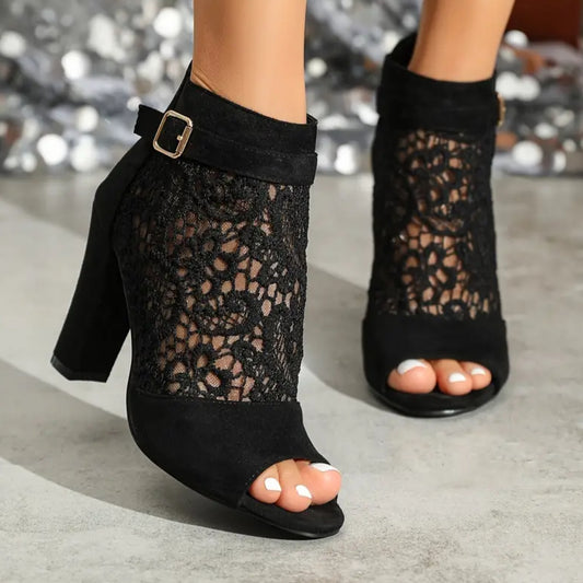 Black Floral Mesh Peep-Toe Shoes with Chunky Heel and Back Zipper Ankle Booties