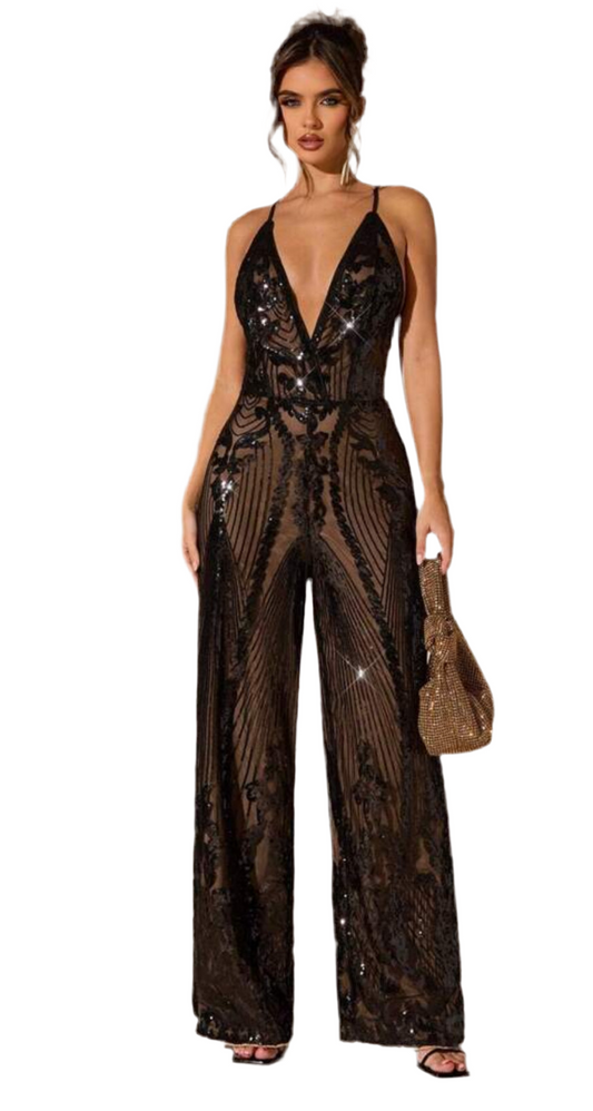 “Genevieve” Crisscross Lace Up Backless Sequin Cami Jumpsuit