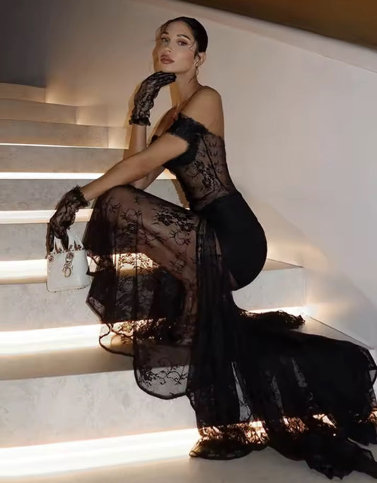 ‘Noir Jacquard’ Mesh Strapless Mermaid Dress