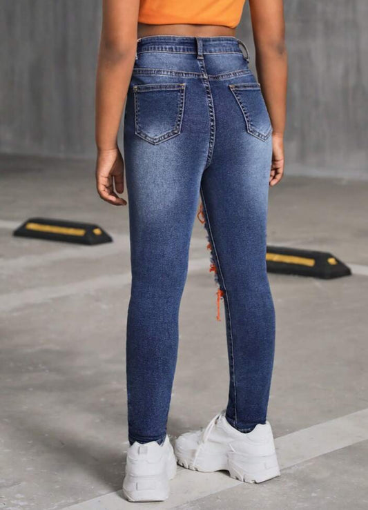 Distressed Ripped Denim Skinny Jeans With Slanted Pocket, Neon Orange, Tween