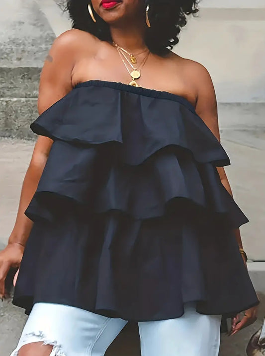 Elastic Layered Ruffle Trim Slight Stretch Tube Top, Plus 💋 Posh