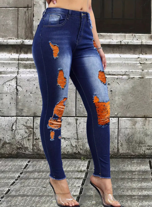 Neon Orange, Chic Distressed Skinny Jeans - Stretch Denim, Fashionable Ripped Detail