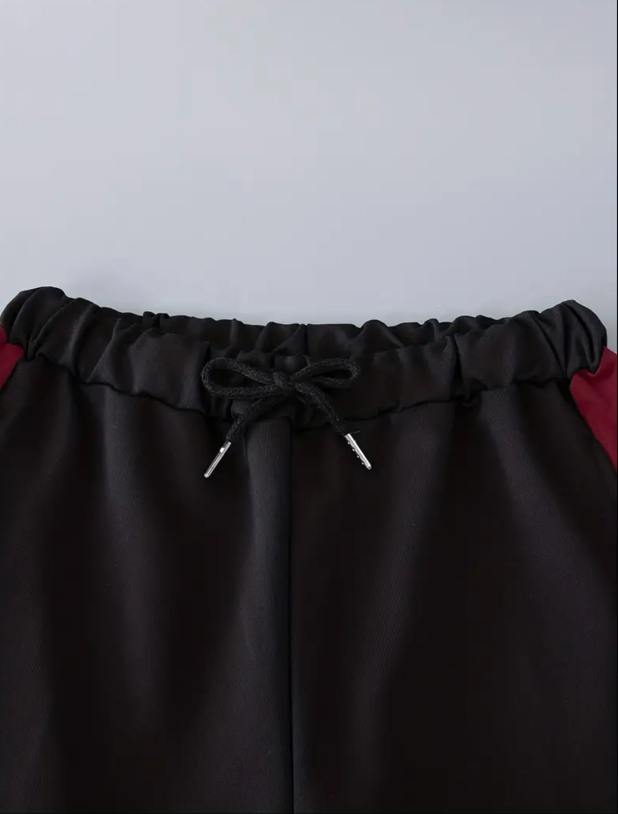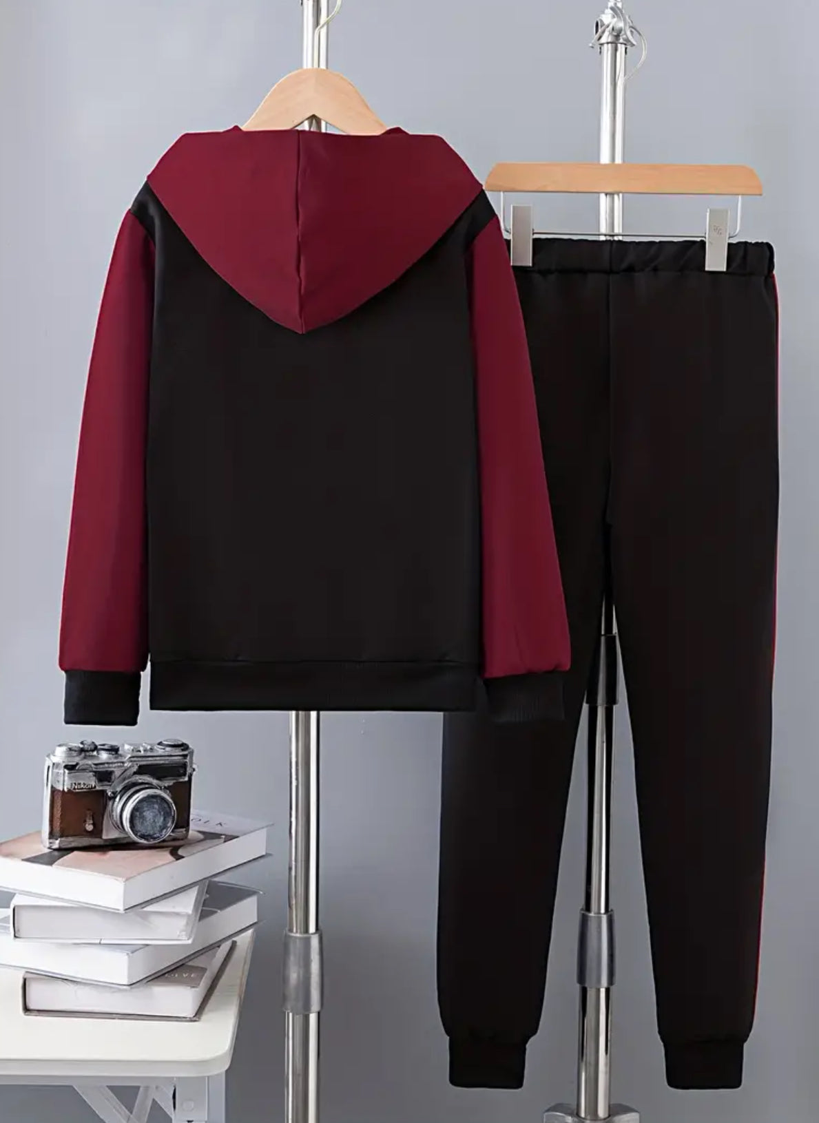 This set includes a comfortable hooded jacket and stylish sweatpants in bold red and black.
