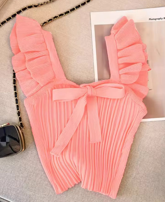 Youth, Tie Front Knitted Crop Top Chic Flutter Sleeve Slim Backless Top