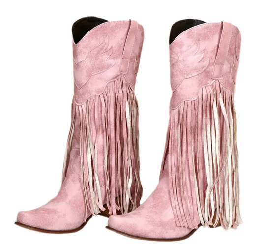 Women Fringe Tassel Cowgirl Boots Stacked Heel Retro Boots | Mid Calf Embroidered