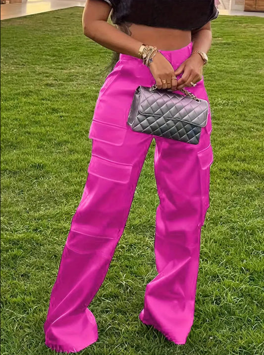 Women Satin Cargo Pants, Multi-Pockets, High Waist, Wide Leg Fashion