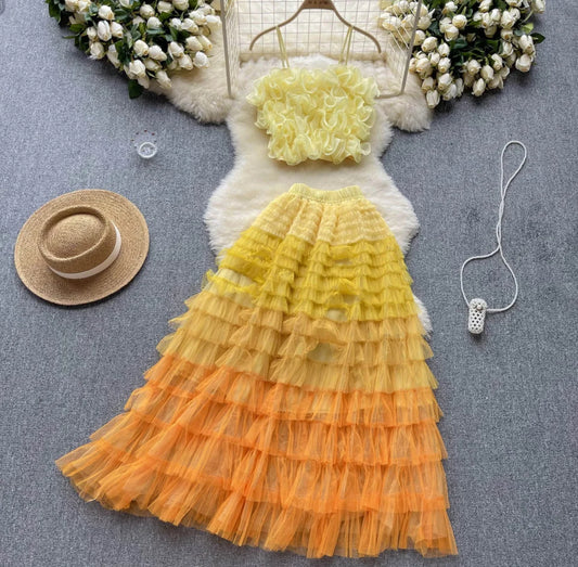 Women Mesh Sheer Bikini Cover-ups Set Camis Crop Tops and Cake Ruffles Long Skirts