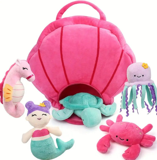 5 Pack Small Sea Creature Plush Toys and Shell Carrying Bag Set, Cute Plushies 0-10 Years