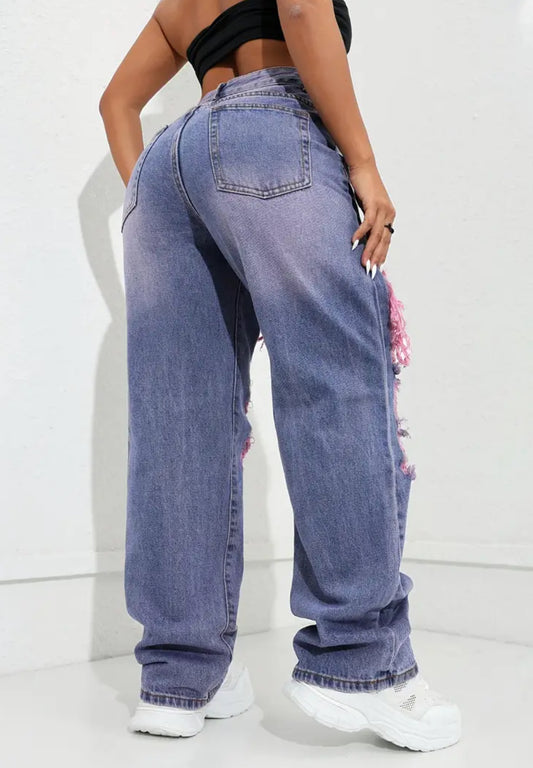 “Pink Denim” High-Waist Baggy Ripped Jeans - Straight Leg, Tummy Control, Fashionable Light Blue Denim, Casual Streetwear