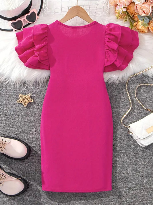 “Hot Pink” Elegant Girls Dress with Ruffle Short Sleeves