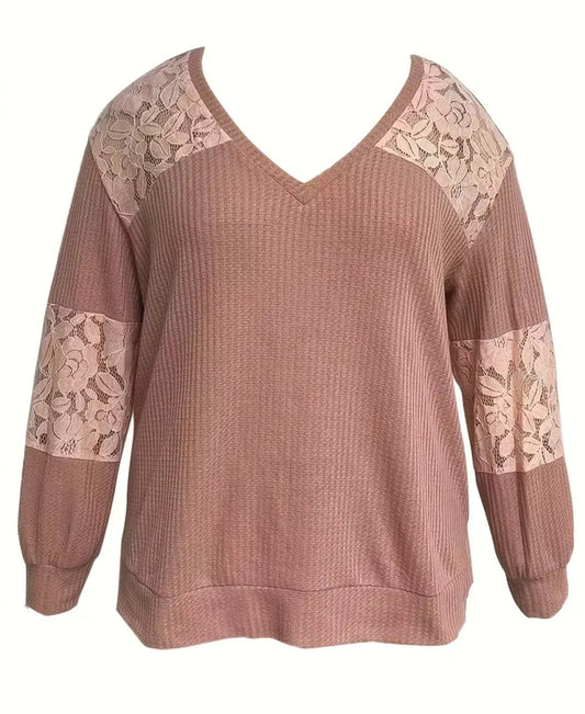 Plus Size, Contrast Lace Long Sleeve, V Neck Slight Stretch Top