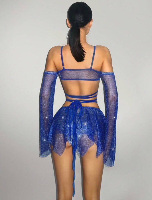 âFairiesâ 2pcs Mesh Lace-Up Off Shoulder Top + Asymmetrical Hem Skirt Set