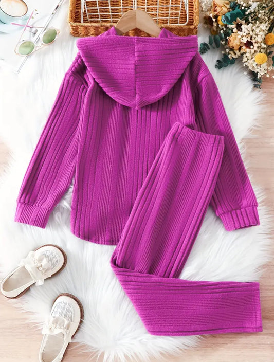 2pcs Girls Casual Ribbed Hoodies + Pants Kids Clothes