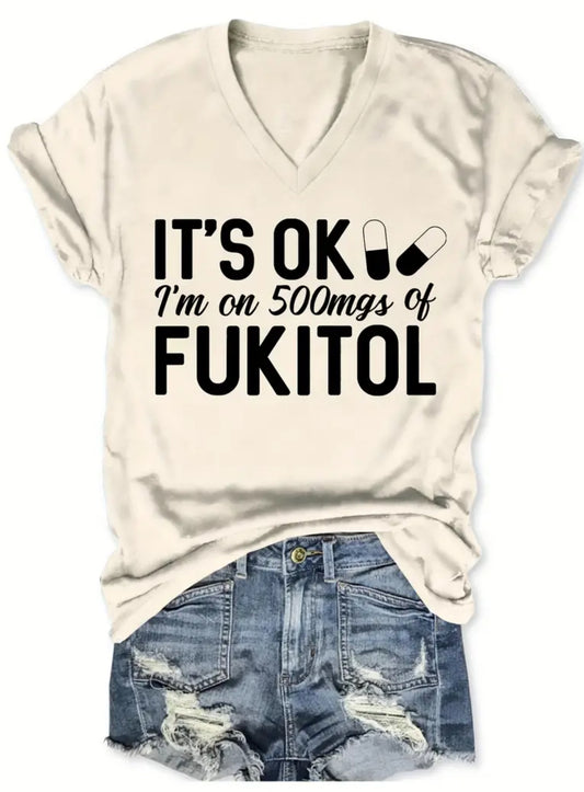 “It’s ok, I’m on 500mgs of Fukitol” Vibrant Letter Print V-Neck T-Shirt