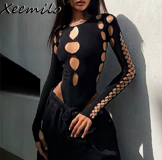 Hollow Out Bodysuit, Long Sleeves, Women’s Streetwear
