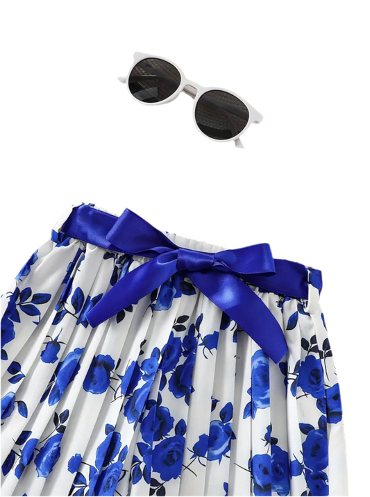Girls ‘BLUE ROSES’ Jumpsuit Round Neck Top with Floral Pattern And Wide Leg Pants with Belt