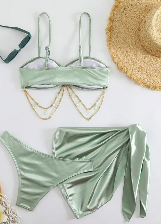 ‘Satin Jade’ Tie-Back Bikini Set with Pendant, 3pcs High-Cut Swimsuit