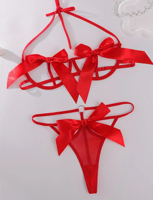 Posh 💋 Mommies Bows Lingerie Set | Cut Out Halter Bra & Ring Linked G-String