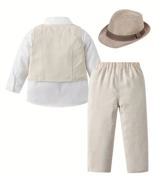 4pcs Boys Formal Gentleman Outfits, Long Sleeve Bowtie Shirt, Pants, Vest & Hat Set