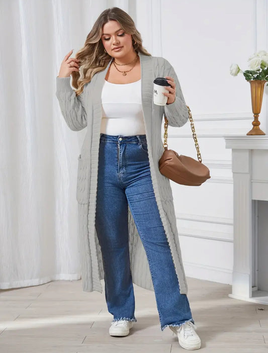 Posh 💋 Mommies Collection Plus Size Casual, Cable Knitted Long Sleeve, Open Front Medium Stretch Cardigan With Pockets