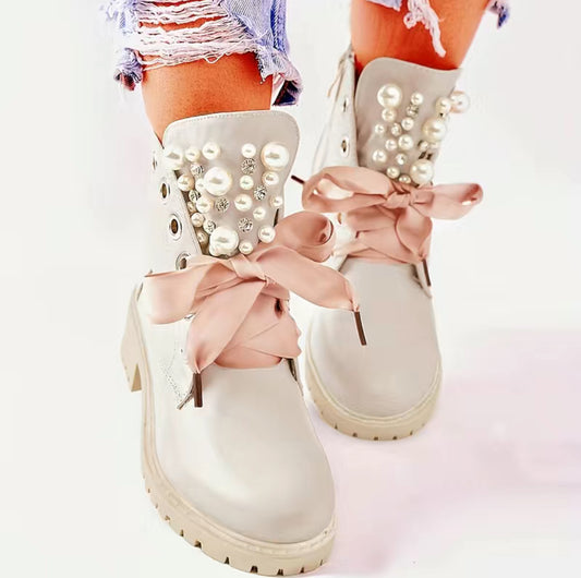 âDiamonds & Pearlsâ Women's Ribbon Lace Up Ankle Boots