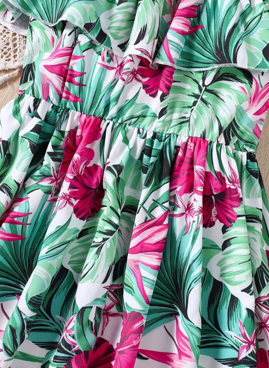 Girls, “Tropical” Off-Shoulder Sling Casual Dress