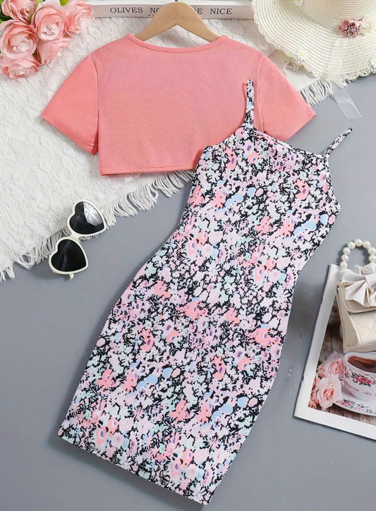 Girls 2PCS Bow Knot Crop Top + Ditsy Floral Cami Dress Set