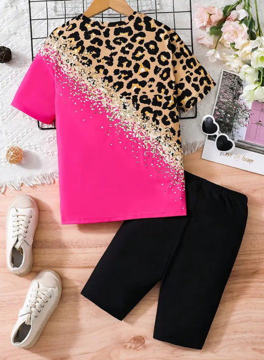 Girl's 2pcs Chic Leopard,T-Shirt Top + Shorts