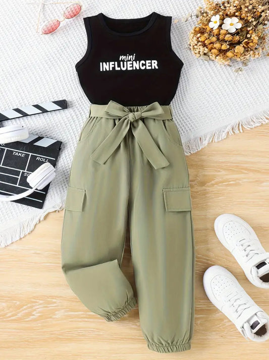 2pcs, MINI INFLUENCER Print Sleeveless Top + Jogger Pants Set