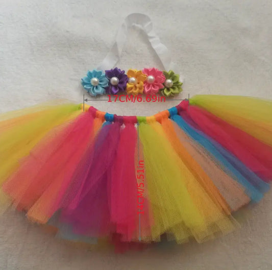 Rainbow Color Baby Skirt Tutu Set with Flower Beads Headband, 🌈