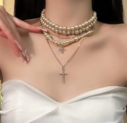 European Multi-Layered Imitation Pearl Necklace with Cross Pendant
