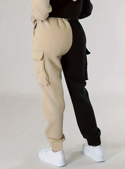 “Gemini” Casual Drawstring Pants Set, Flap Pockets, Color Block Cargo Pants