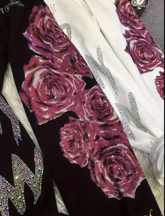“Rose Rhinestone” Oversized Drawstring Sweatpants with Pockets + Elastic Waist