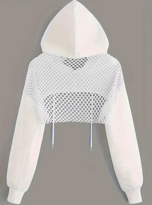 Soft Slight Stretch Contrast Mesh Details, Pullover Long Sleeve Hooded Crop Sweatshirt, Women’s/ Teens