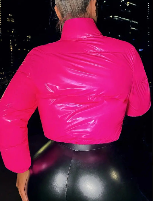 “Pink Vibes” Stand Neck Long Sleeve Crop Cotton-padded Jacket Coat, Zipper Front