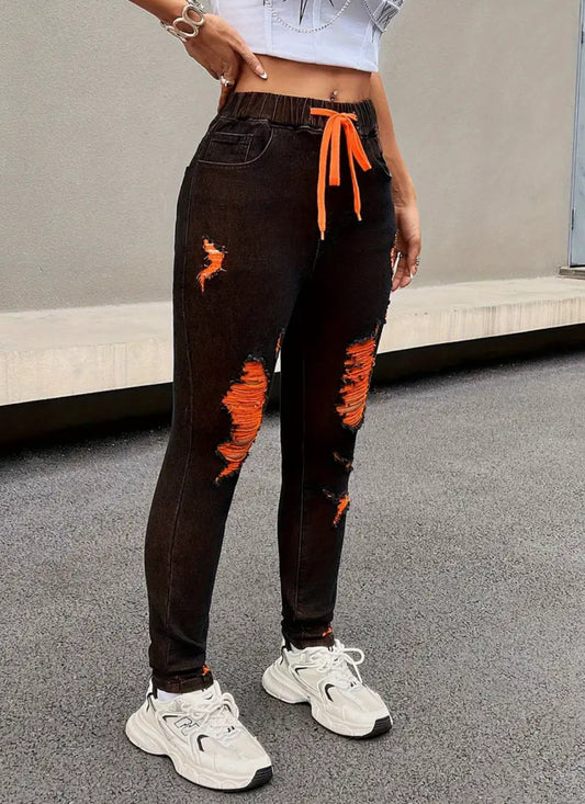 Orange Ripped Skinny Jeans High-Stretch with Adjustable Drawstring Waistband - Women's Fashion