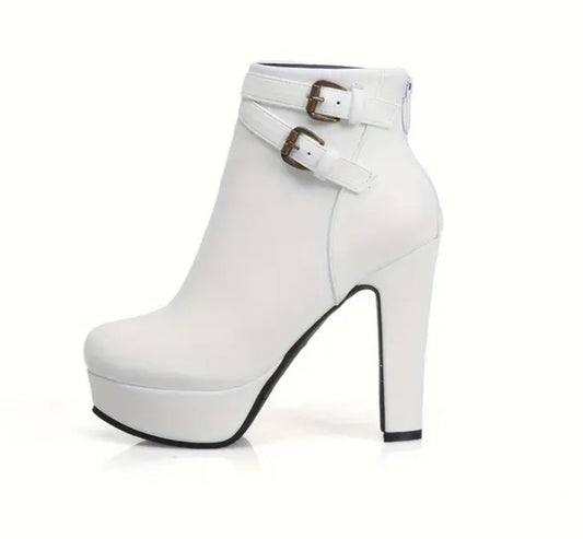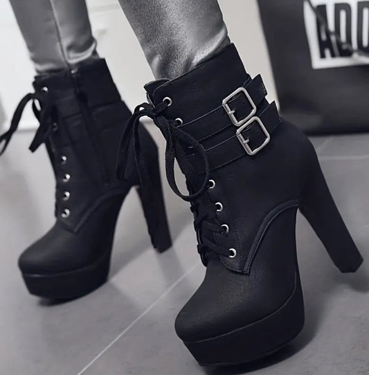 Stiletto Heel Boots with Stable Block Base - Secure Buckle Ankle Strap - Lace Up