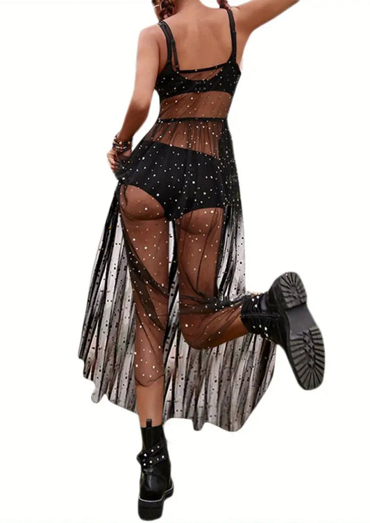Sequined Beach/ Festival Cover Up Dress - Sleeveless Square Neck, Split Front