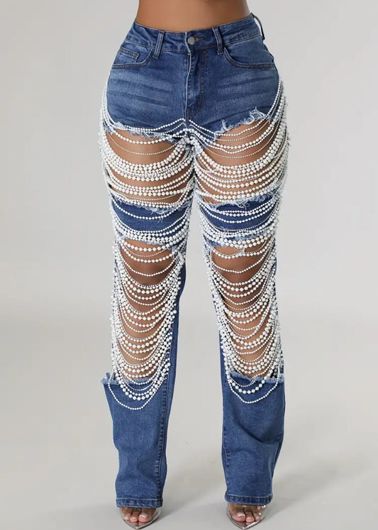 Pearl Chain, Boyfriend Denim Jeans, Straight Leg, Mid-Rise, Distressed Ripped