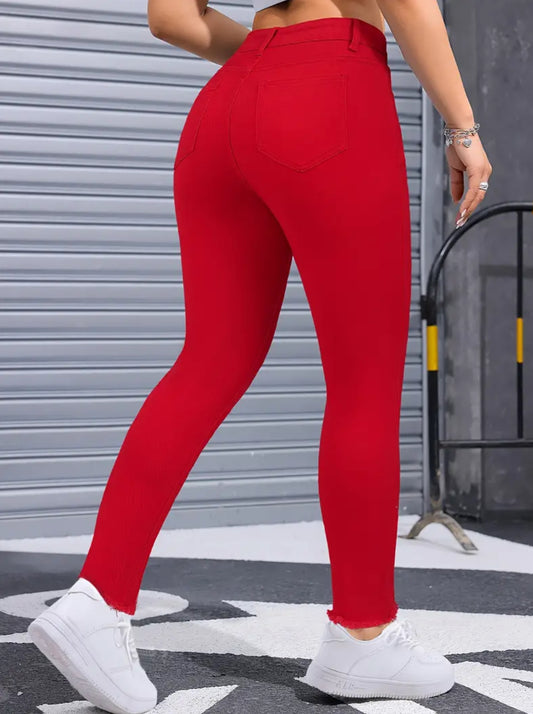 Distressed Ripped Red Sexy Zipper Button Closure Jeans, Skinny Fit, Women's Denim