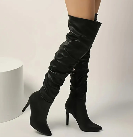 “Midnight” Over-the-Knee Stiletto Boots With Side Zipper And Stretch Fit