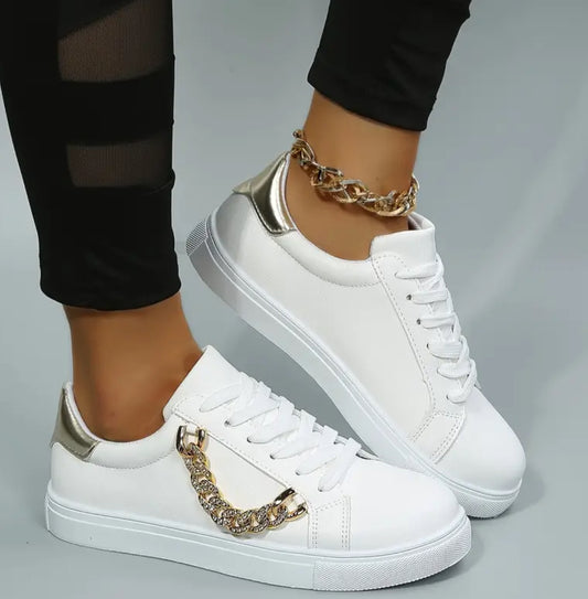 “Gold” Metal Chain Decor, White Skate Shoes, Simple Casual Versatile Faux Leather